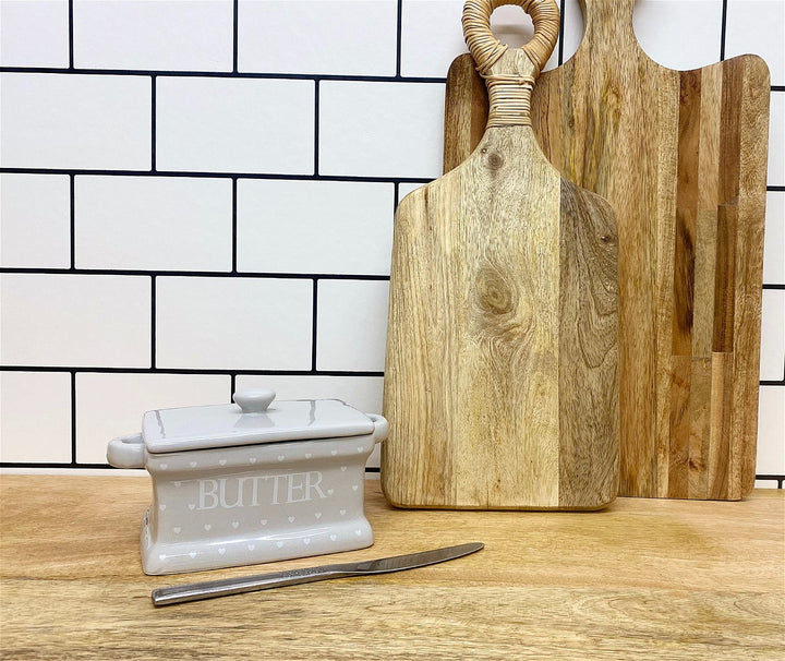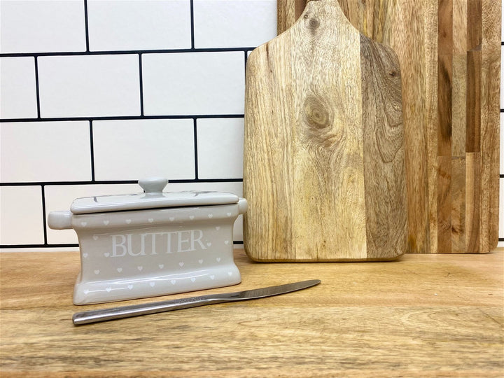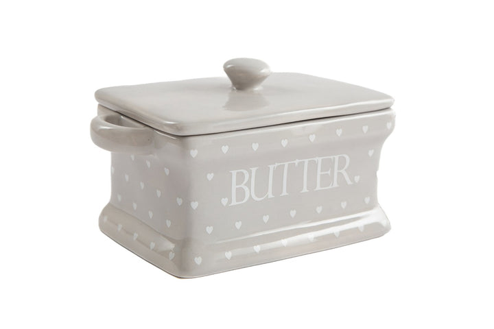 A grey ceramic butter dish with a hearts design and a glazed finish. A traditonal solution to storing butter. A part of the Hearts collection. Measurements: D11 x H10.5 x W18.5cm