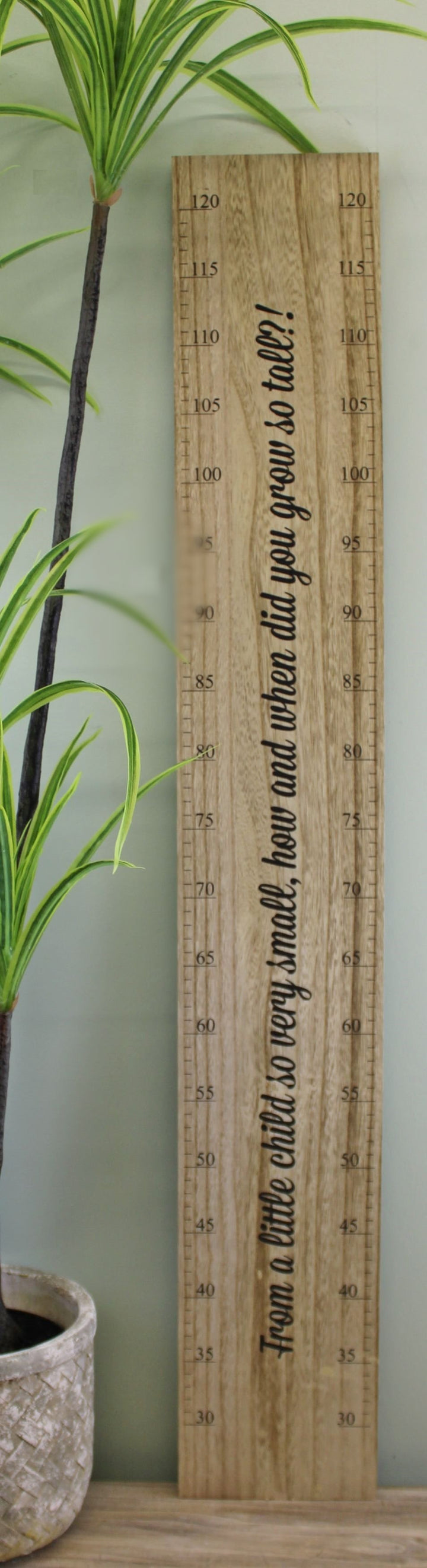 A lovely wall plaque to hang to chart your family's growth over their younger years. Features the quote From a little child so very small, how and when did you grow so tall? Made of MDF with 2 fittings to the rear for wall hanging. Designed to be hung 24cm from floor level for accurate measuring. Measurements: 1 x 100 x 15cm SKU: WP2246
