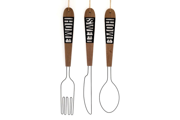 A knife, fork and spoon wall decoration made of black wire with a wooden handle in which are metal cut outs spelling individually HOME, SWEET, HOME. Each piece has a string loop for hanging purposes. The overall length is 77cm. The wooden handle is 42 cm long with the cutouts each being 18 cm x 7.5 cm at the widest end. Overall measurements: D1 x H77 x W14cm SKU: KG1022