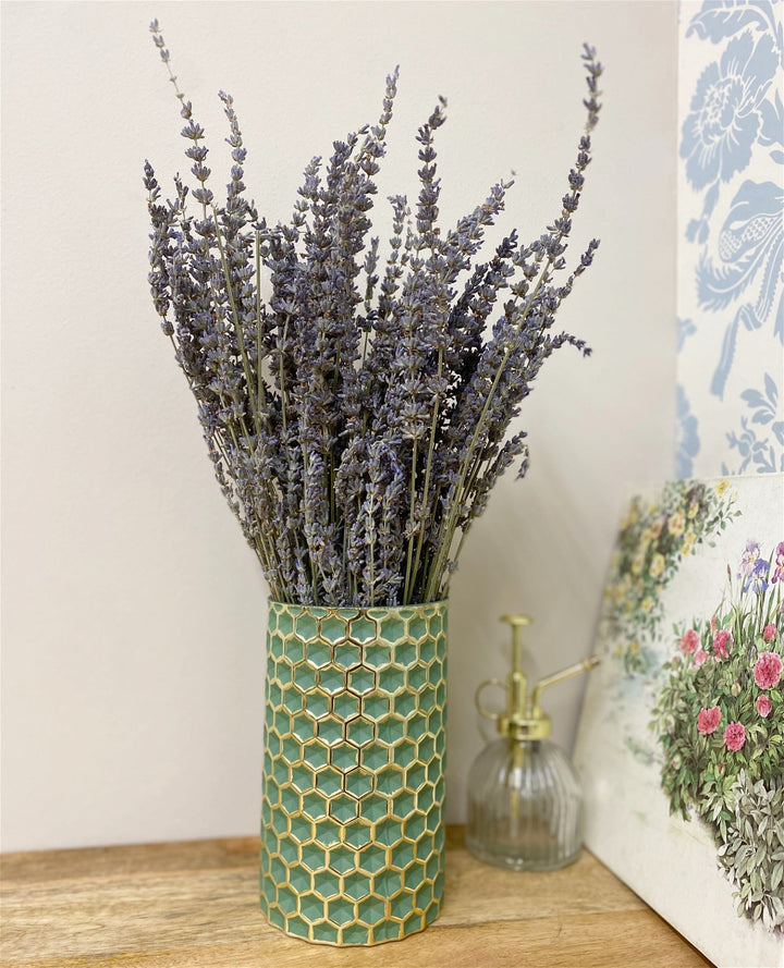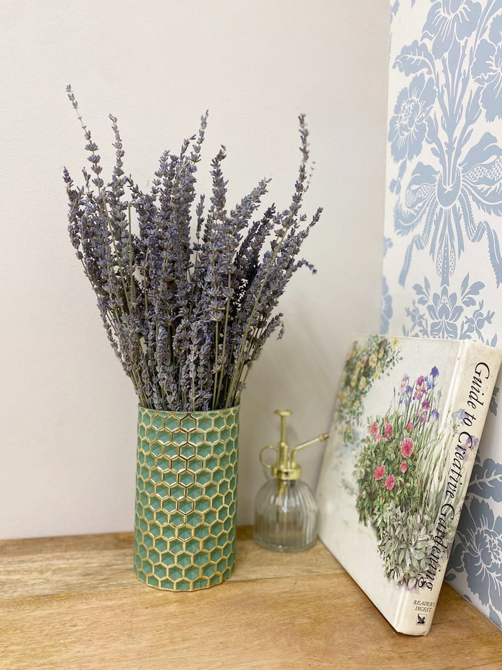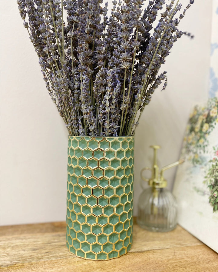 Add a touch of natural elegance to your home decor with this beautiful honeycomb cylinder vase, in green. Made from high-quality glass, this vase features a stunning gold edged honeycomb pattern on its cylindrical surface, adding depth and texture to its design. The perfect size for holding flowers, branches, or other decorative items, and its sturdy cylindrical shape provides a stable base for tall or large arrangements. Measurements: D11 x H18 x W11cm