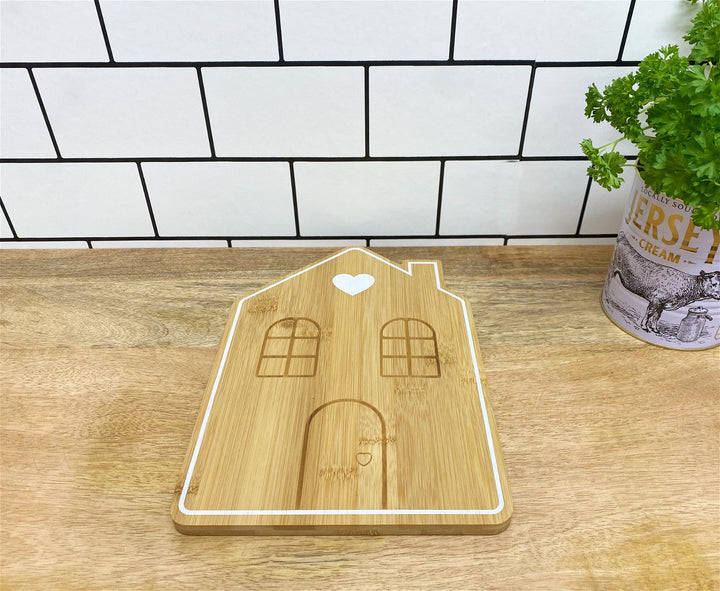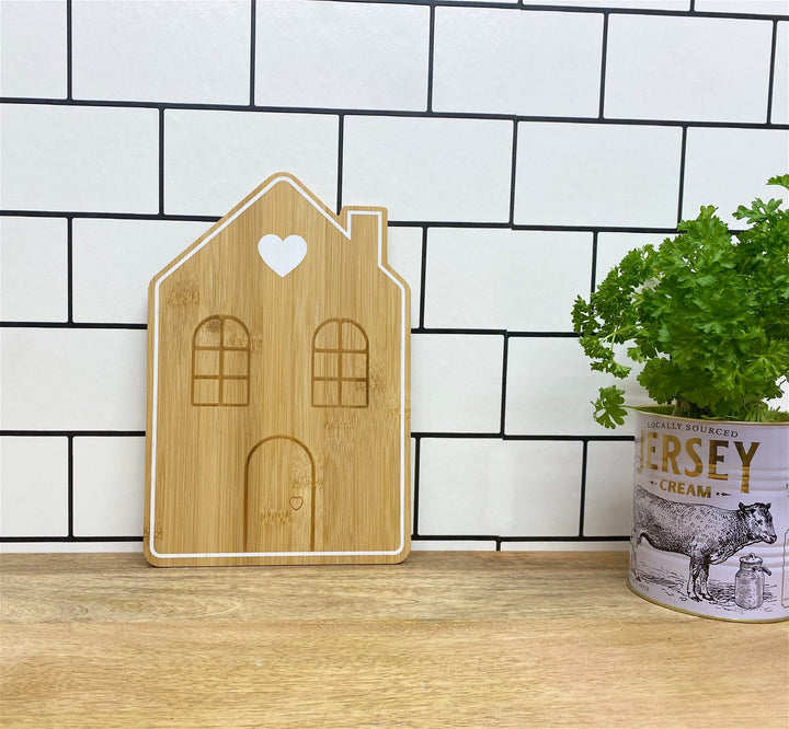 A wooden serving tray with house detail including door, windows and chimney. This board is made of bamboo and is hand wash only. It is a useful item for serving any food treats to family and friends. Measurements: D1 x H28 x W19cm