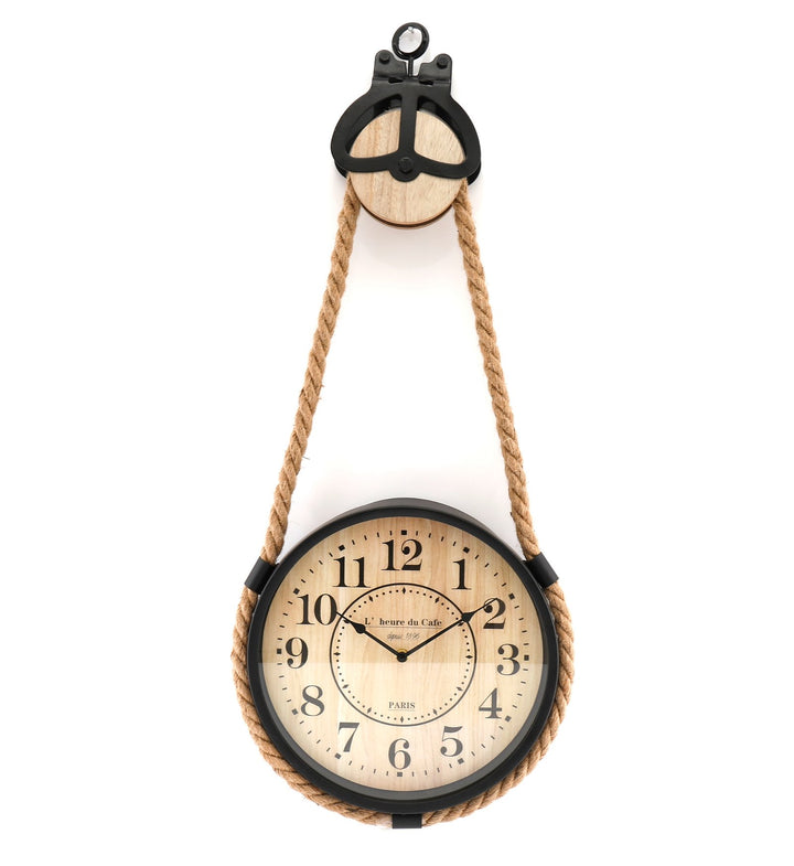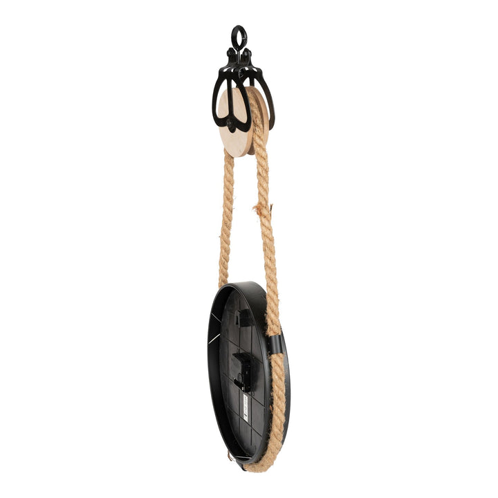 A round black metal framed clock with hanging rope and a black metal and wooden pulley. This unique vintage looking clock would be a great addition to a farmhouse kitchen or a workshop. Clock diameter is 30cm with a depth of 4cm. Distance between clock and pulley is 18cm. Pulley including hook is 20cm. The pulley wheel is made of wood. Requires 1 x AA battery that is not included. Overall measurements are: D74 x H5 x W32cm SKU: CL2186