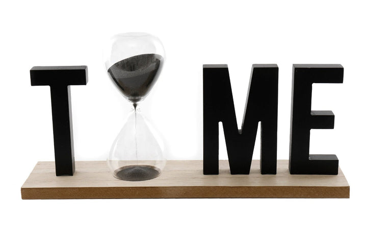 A contemporary decoration of cut out black letters T, M and E with the I in "time" being an hour glass with black filings. The hour glass sits within a carved out base which has a small magnet to attract the iron filings in an interesting form. The filngs take 1 minute to sift through. The natural wood base is 32 x 8 x 1.3cm. The black letters are 11cm tall and the hour glass is H15cm x W6cm. Overall measurements: D9 x H17 x W33cm SKU: KG1023
