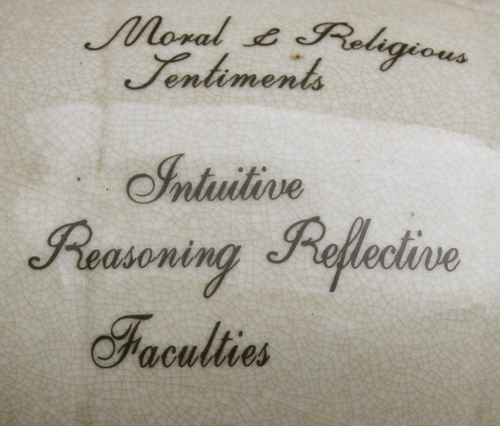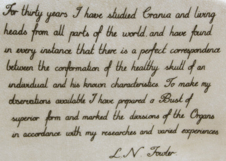 Phrenology is from Ancient Greek meaning 'knowledge'. It is a pseudoscience which involves measuring bumps on the skull to predict mental traits. This ceramic phrenology head stands 42cm tall and features a quote from Mr L N Fowler, the founder of the art along with the sections of the head and their characteristics. Made of ceramic, off white in colour with a crackled finish and black lettering. Measurements: 23 x 42 x 21cm