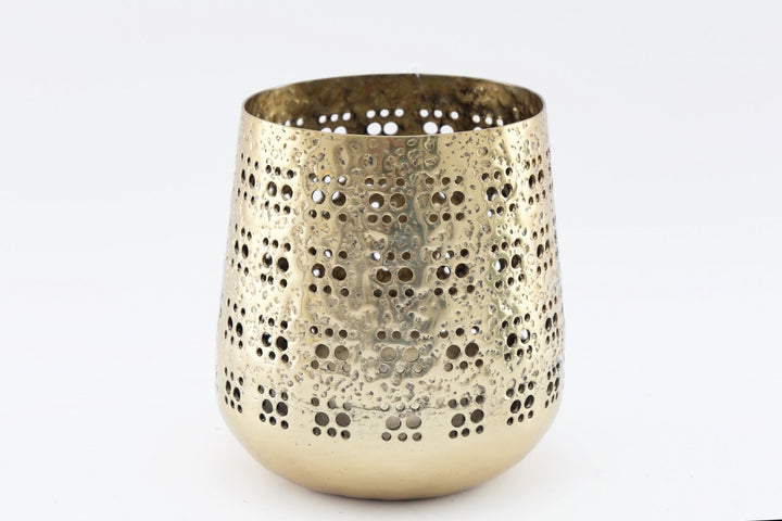 This gold colour metal pot is crafted in a Moroccan style with hammered perforations to conjure oriental shadows in a room. The dazzling design captures the candlelight and creates a romantic atmosphere. A charming addition to any room. Measurements: D17 x H20 x W17cm SKU: CH6147