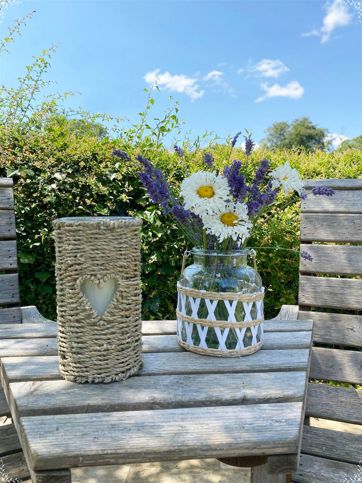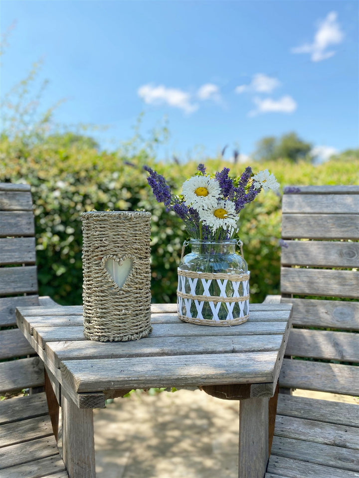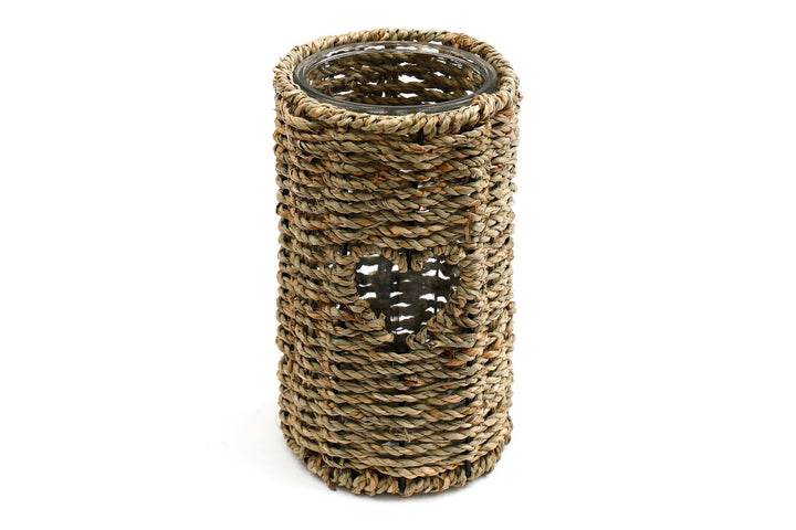 A large twisted seagrass candle holder, with heart cut out and glass insert. Made with natural seagrass and held together with a wire metal frame. Can hold one large candle or tealight. Measurements: D12 x H21 x W12cm
