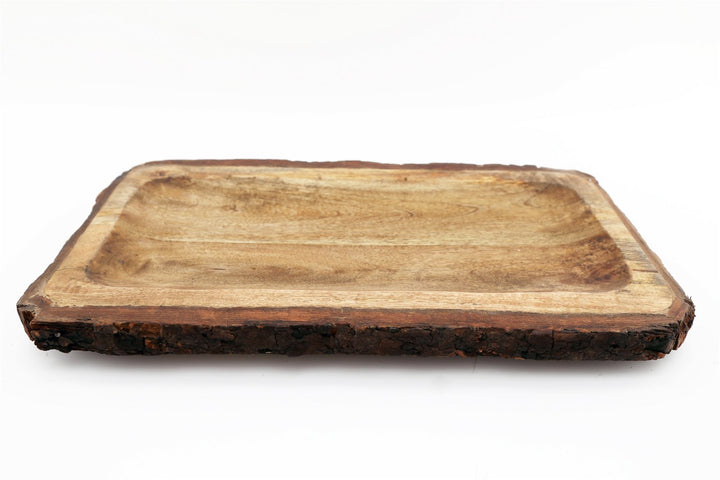 A rustic wooden serving platter with bark edging. This rural piece could be used as charcuterie Platter, dessert plate, food dish, serving tray or cookie Platter, perfect for any kind of event or family gathering. Measurements: D21.5 x H3.5 x W41cm SKU: KG0971