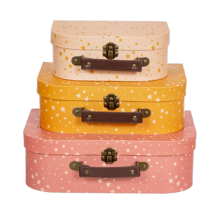 Picking up on the popular scandi kids trend, led by a colourway of muted pastels. The set features three different sizes, with the smaller fitting into the larger. Perfect for storing letters, crafts and stationery. Made from cardboard paper with a PU leather handle and bronze metal accessories Measurements: D29 x H20 x W9.3cm