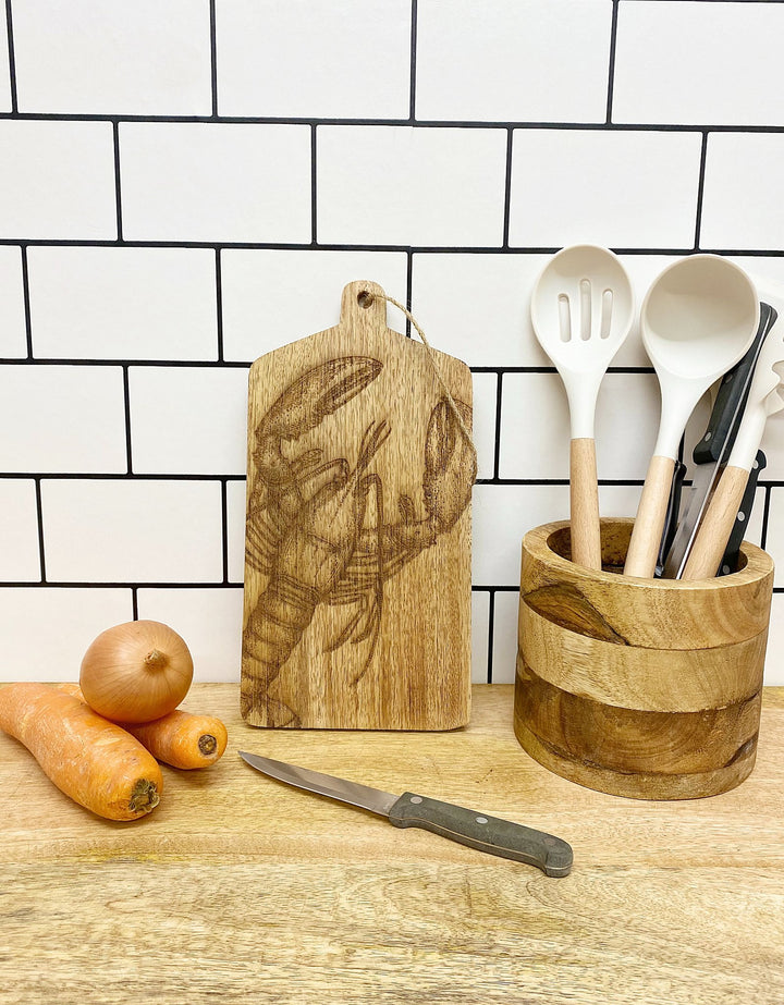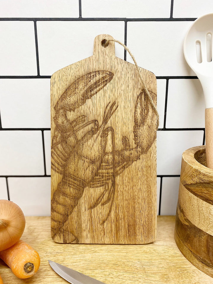 A wooden cheese board with an engraved portrait of a lobster on the front, with a jute string loop. The cheese board is 30cm in length including the handle and made from 100% Mango Wood. Measurements: D15.5 x H1 x W30cm
