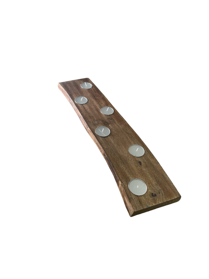 Accentuate your tabletop with this long mango wood tea light holder which accommodates six candles. Create a captivating centerpiece with this long mango wood holder designed for six tea lights. Six candles included. Measurements: D2.4 x H12 x W51cm