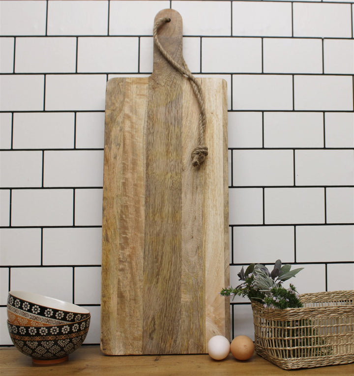 This beautiful solid wood serving platter is raised on two stands of 5cm depth and has a string loop from the handle for hanging, allowing it to be easily stored. It could be used as a stunning centre piece on a dining table or kitchen island to display a smorgasbord of delights. The simplicity of the piece would also befit a picnic setting for al fresco entertainment. Measurements: D25 x H5 x W70cm
