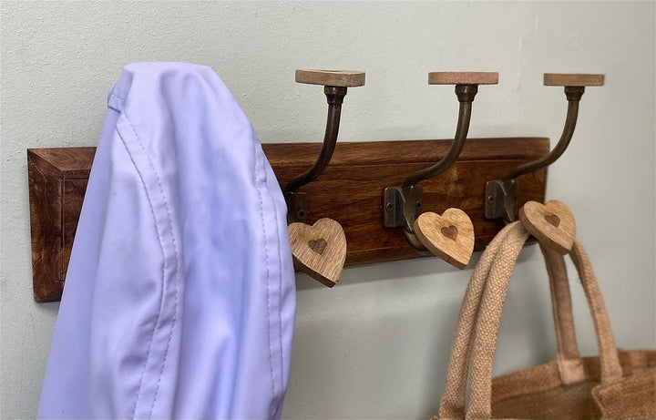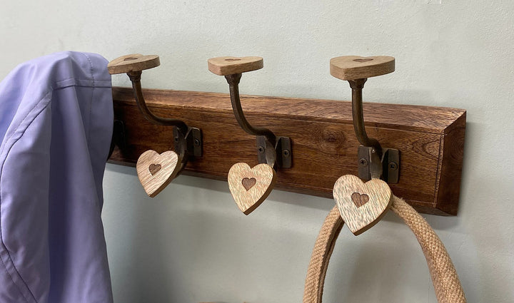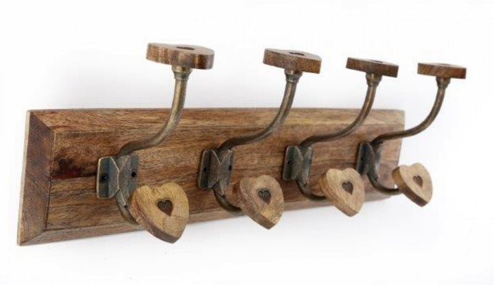 A natural bevelled edged mango wood plinth with four tarnished brass double coat hooks. Each one has a beautifully carved heart shaped knobs that are decorated with a smaller heart shape. An attractive piece of wood work that is both practical and functional for every home. Overall Measurements: D12 x H17 x W44.5cm Hooks measurements: D11 x H14.5 x W4.5cm SKU: KG2008