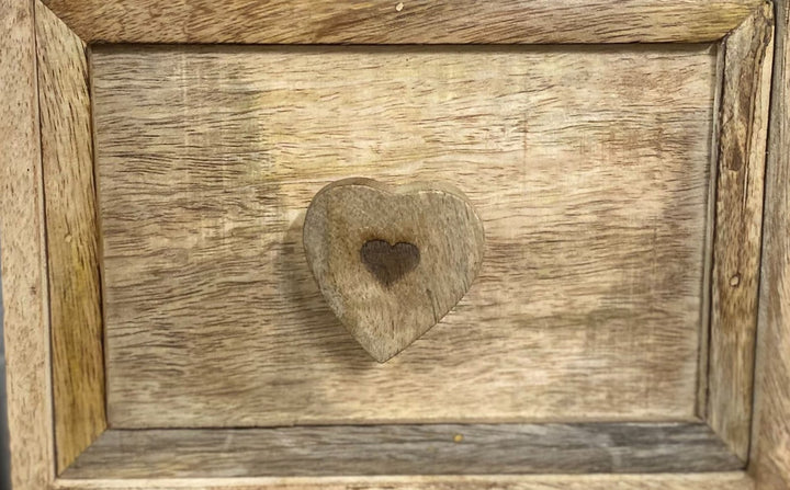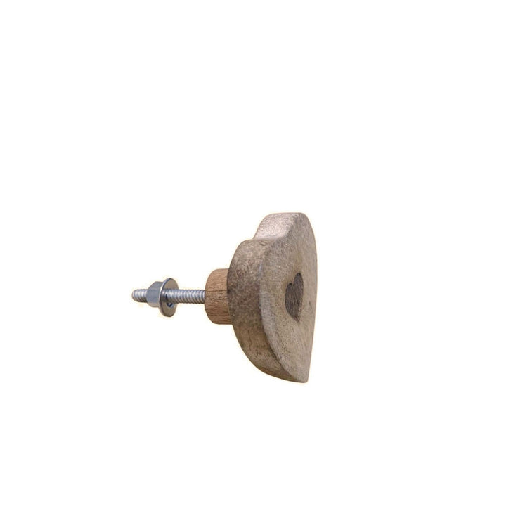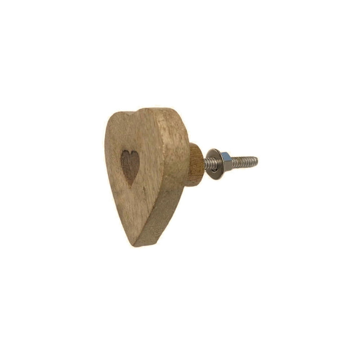 Wooden heart shape knob with a smaller heart engraved in the centre that would grace any cupboard, drawer or dresser. These are sold singularly. The heart is W4.5cm x H5cm x D0.5cm and the spindle length is 2.7cm. Overall measurements: D6 x H4.5 x W4.5cm SKU: KG2010