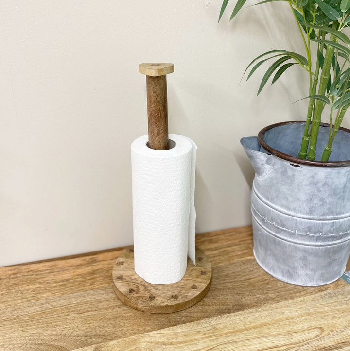 Natural wooden vertical kitchen roll holder with heart design around the base which is decorated by the heart designs. A carved heart shape grace's the top and the dowling unscrews from the base to place the kitchen towel on. A beautiful addition to a rustic style kitchen. Overall measurements: D16 x H34 x W16cm SKU: KG2006