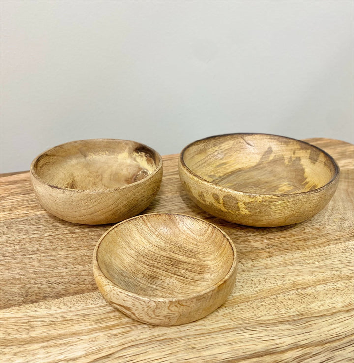 A set of three crafted wooden bowls suitable for nibbles or trinkets. The large bowl is 12.5cm in diameter, Medium 10.5cm diameter and the small is 8.5cm in diameter. When nested the overall measurements are: D13 x H6 x W13cm SKU: KG0973