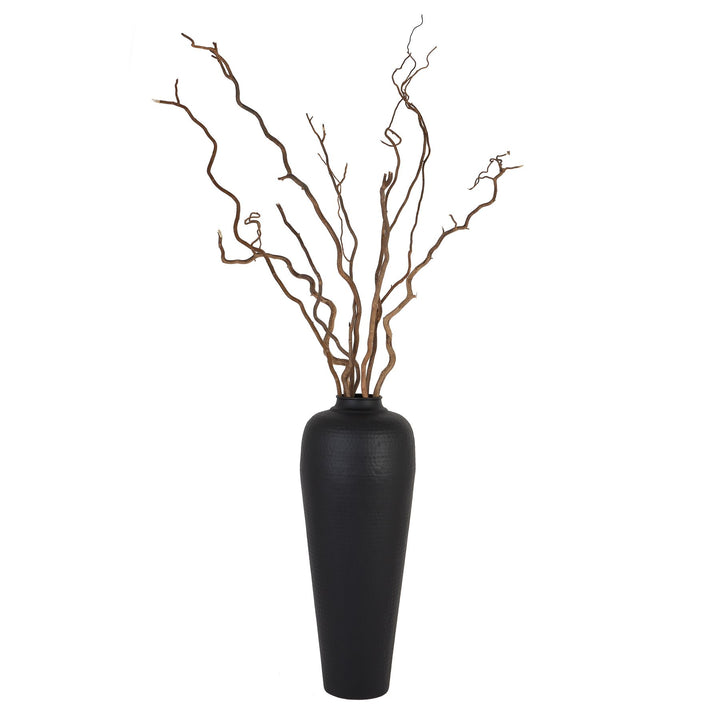 Unveil a new dimension of style with our Matt Black Large Hammered Vase, a masterpiece that demands attention in any setting. This tall, slender vessel boasts an intricate hammered texture, creating a mesmerizing dance of light and shadow across its surface. The sophisticated matte black finish speaks of modern elegance, while the removable lid adds a layer of versatility and mystery. Essential for upscale home decor retailers and design showrooms, this vase stands as a true conversation piece. Its impressive size makes it perfect for grand floral displays or as a standalone sculptural element. The timeless design seamlessly integrates with various interior styles, from sleek contemporary to eclectic bohemian. Pair this vase with metallic accents for a luxurious ambiance, or juxtapose it with natural wood elements for an organic modern feel. It shines when grouped with other textured pieces of varying heights. Recommend placement in entryways, on mantels, or as a focal point in living spaces. This adaptable piece caters to discerning clients looking to infuse depth and texture into their interiors. By stocking this vase, you'll offer customers a touch of artisanal refinement that will distinguish any room. Its distinctive design and superior craftsmanship ensure it will be a coveted item in your inventory.