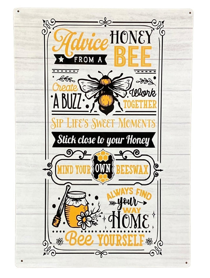 Part of our fantastic range of reproduction vintage metal signs. Advice From A Honey Bee sign. Made in the UK from aluminium, suitable for use inside or outside. Every poster features 4 drill holes for ease of fixing to the wall. Measurements: D0.1 x H41 x W28cm