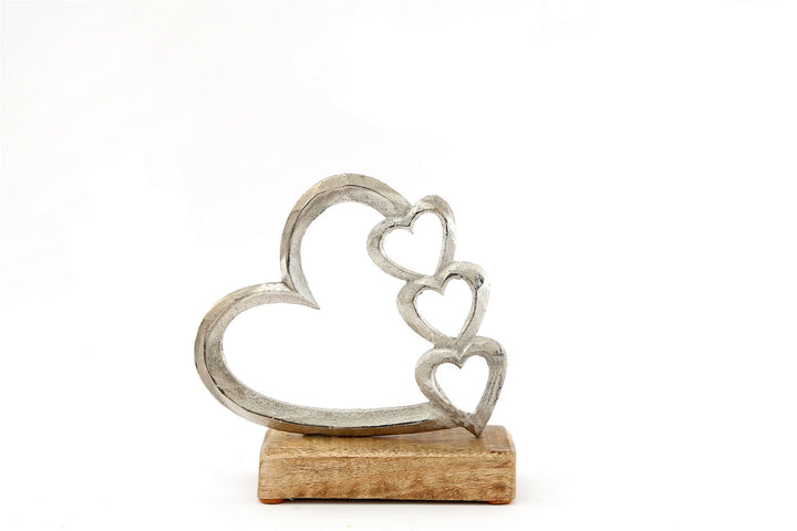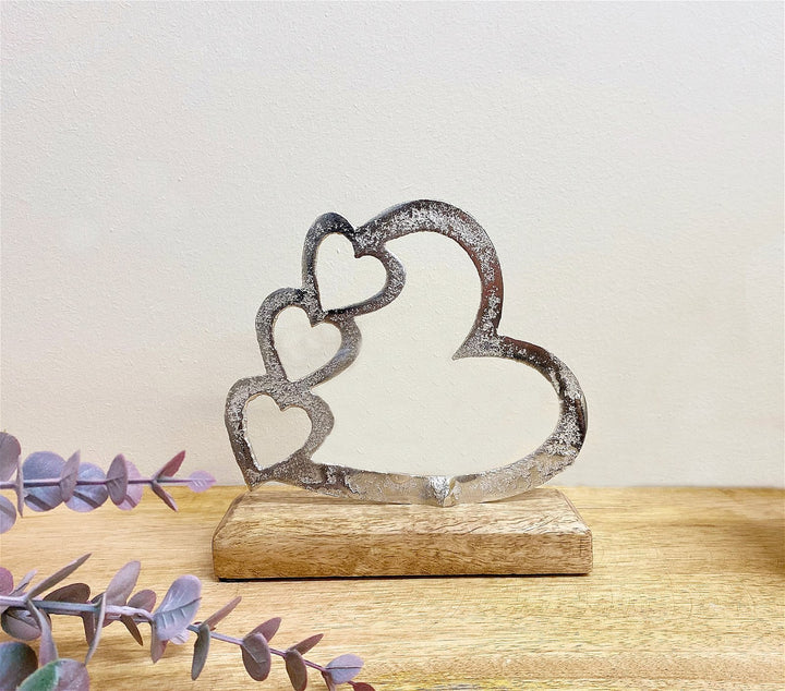 Metal Silver Four Heart Ornament On A Wooden Base Small
