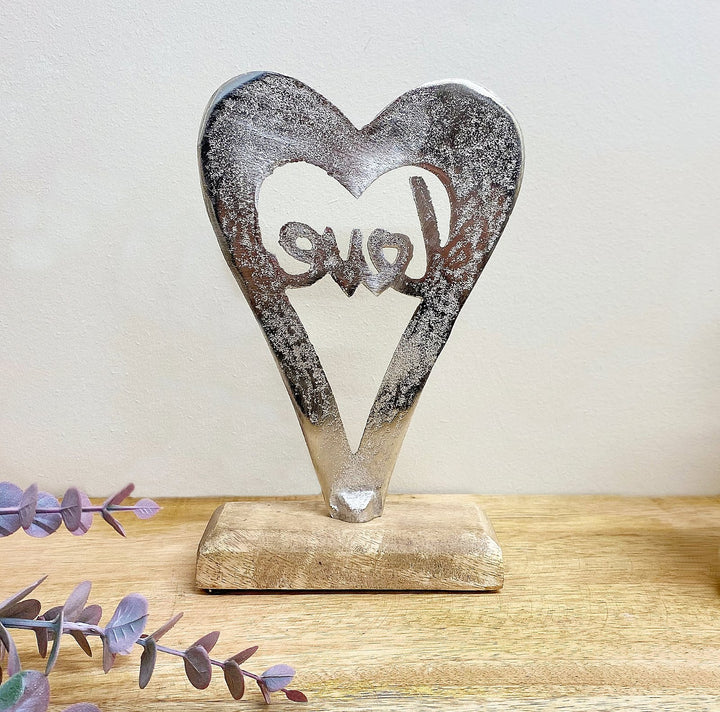 A small silver metal heart with the word 'love' displayed inside set on a wooden plinth. This is a versatile piece with the sliver colour giving a nice contrast to any backdrop. The plinth size measures 5 x 13 x 2.5cm. Measurements: D5 x H21 x W13.7cm