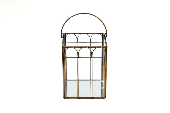 Beautiful table-top or mantelpiece decor, with multiple glass panels sitting between iron frames, in antique gold finish. Square in shape, with mirrored base and carry handle. Designed to be suitable for use both indoors and outdoors, they make a stunning statement paired in their different sizes. Measurements: D12 x H16 x W12cm