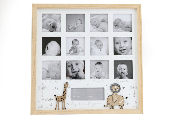 A wooden hanging frame, part of the Safari Range, featuring 12 spaces for your child’s milestone photos. The natural wood frame 35 x 35 cm has a cream mount with 3D cut out images of safari animals, memories can be captured month by month through the baby’s first year. This cute item would be a lovely addition to any child's bedroom or nursery. Measurements: D1 x H35 x W35cm SKU: BB0404