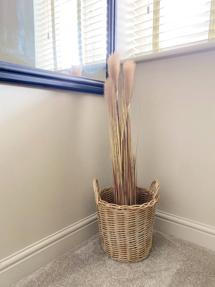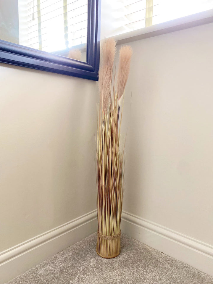 A large spray of faux pampas grass with a foamed centre, twinned with natural string. This elegant dried grass bundle is self-standing. Measurements: D10 x H90 x W10cm