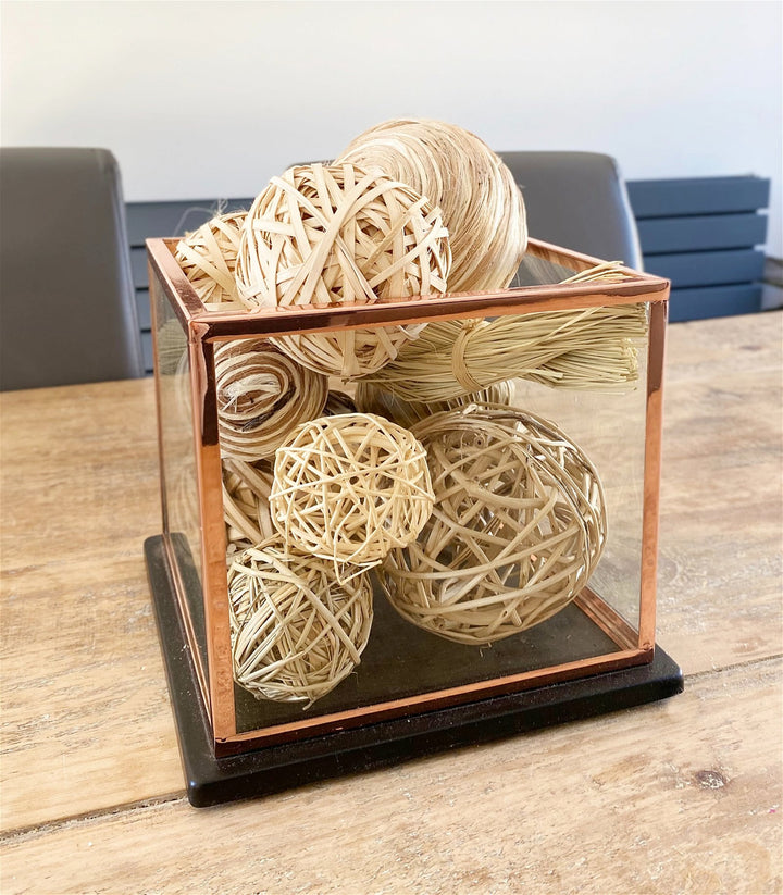 Small decorative accessories made of natural materials that are used to add texture and interest to a room's decor. The balls are made of materials such as rattan, seagrass, and jute and are crafted to create spherical shapes. The natural materials used to make the balls give them a rustic and earthy appearance that complements a variety of decor styles, including bohemian, coastal, and farmhouse-inspired interiors. The balls are lightweight and vary in size, making them ideal for decorating and styling different spaces. The ball accessories can be used in a variety of ways to add visual interest to a room. They can be arranged in a bowl or tray as a centrepiece on a coffee table or dining table, or they can be placed on a shelf or mantel as a decorative accent. They could also be hung from the ceiling or placed in a basket to create a unique and eye-catching display. Approx twenty pieces. Measurements: D20 x H36 x W26cm