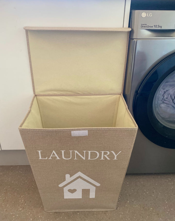 A natural jute fabric laundry basket with carrying handles and fold over lid. The lid has a Velcro fastening while the side of the basket have a house and laundry logo in white. Base of the basket 33cm x 22cm, height 50cm, the top of the basket 42cm x29cm. This item will fold up when not in use and is easy to store. This attractive item is part of our 'Kind Home' range. The folded measurements are: D3.5 x H50 x W43cm