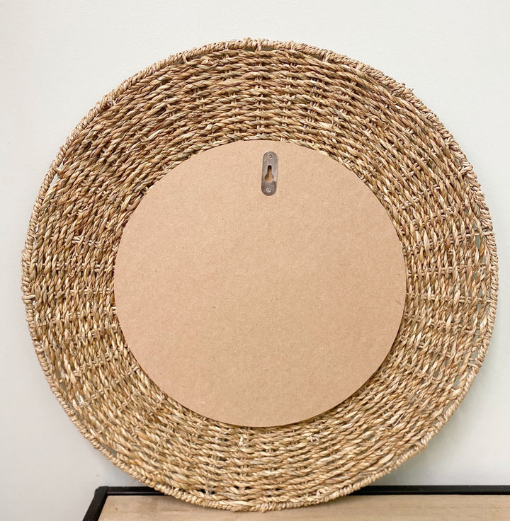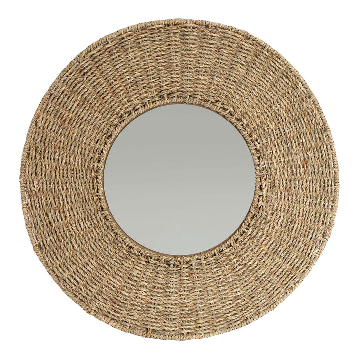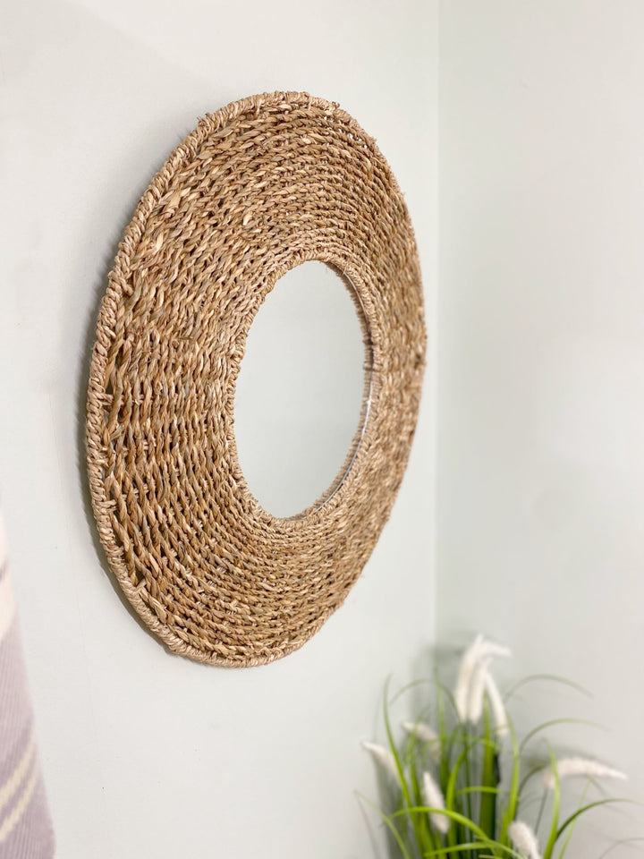 Natural seagrass woven circular band around a mirror. A very attractive piece, of crafted seagrass embracing a circular mirror. A natural rustic piece that is both fresh and elegant, suitable for any room in the home. Overall measurements: D1.8 x H50 x W50cm Mirror: 24cm diameter.