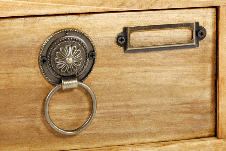 Office Organiser with 11 Drawers of Varying Sizes. A very unique set of drawers that are in 5 very useful but different sizes making this piece of office furniture the most useful we have to offer. The six drawer at the top are all equally sized at, internally 4cm high, 9.5cm and wide 12cm deep and externally 5cm high, 12cm wide, 14.5cm deep, but they do accommodate two styles of handles which makes this piece very interesting. The two larger drawers on the third row down internally measure 6.5cm high, 16cm wide, 12cm deep & externally this drawer measures 7cm high, 18 cm wide and 14cm deep. These two drawers also have the information slip for you to have the opportunity to be extra organised. On the bottom set of drawers they are varying sizes. The left one internally measures 6.5cm high, 6cm wide, 12 cm deep, externally 7cm high, 8cm wide, 14.5cm deep. The middle drawer internally measures 6.5cm high, 9.5cm wide, 12cm deep, externally 7cm high, 11.5cm wide 14.5cm deep. The right hand drawer internally measures 6.5cm high, 13.5cm wide, 12cm deep, externally 7cm high, 16cm wide 14.5cm deep. These drawers have the same handles as our popular N0136, N0159 and N0160 range so would complement these items beautifully. The whole item measures 41cm high, 35cm wide and 15cm deep making it a lovely table top feature to fit into any room of your house or professional office space. This item forms part of the Popular Geko shabby chic office range and will compliment any item from this range.
