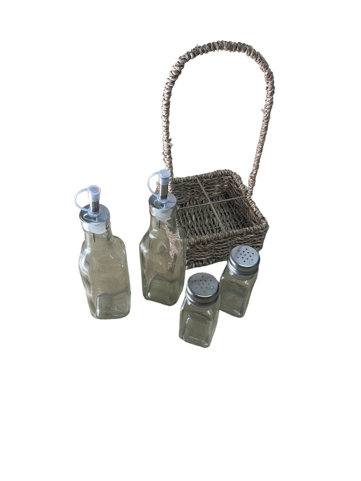 Oils and Cruet Set With Seagrass Holder 30cm