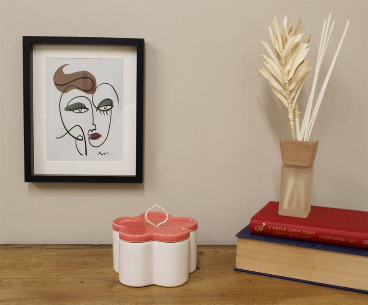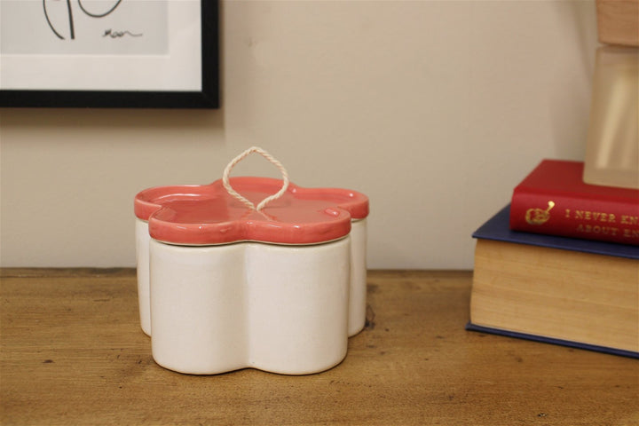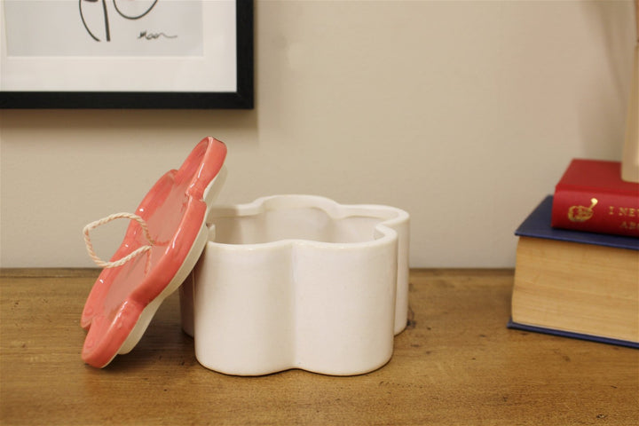 Small ceramic flower shape trinket box, with orange lid. Perfect for storing small vanity items in. Measurements: D14 x H8 x W14cm