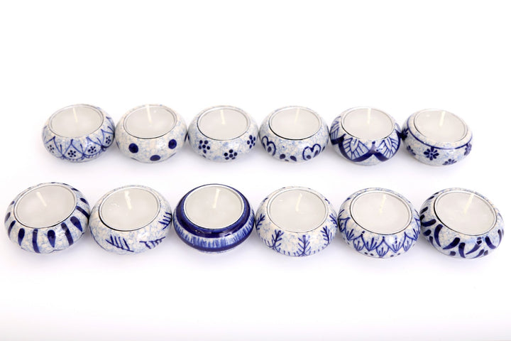 Set of twelve tealights housed in ceramic holders of random blue and white designs. The ceramic holders are elegantly glazed and the tealights can be removed and replaced when spent. The gentle glow from a tealight brings warmth to every occasion. Measurements: D6 x H3 x W6cm SKU: CH6114