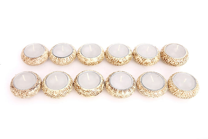 Set of twelve tealights housed in ceramic holders of natural beige tints designs. The ceramic holders are elegantly glazed and the tealights can be removed and replaced when spent. The gentle glow from a tealight brings warmth to every occasion. Measurements: D6 x H2.5 x W6cm SKU: CH6127