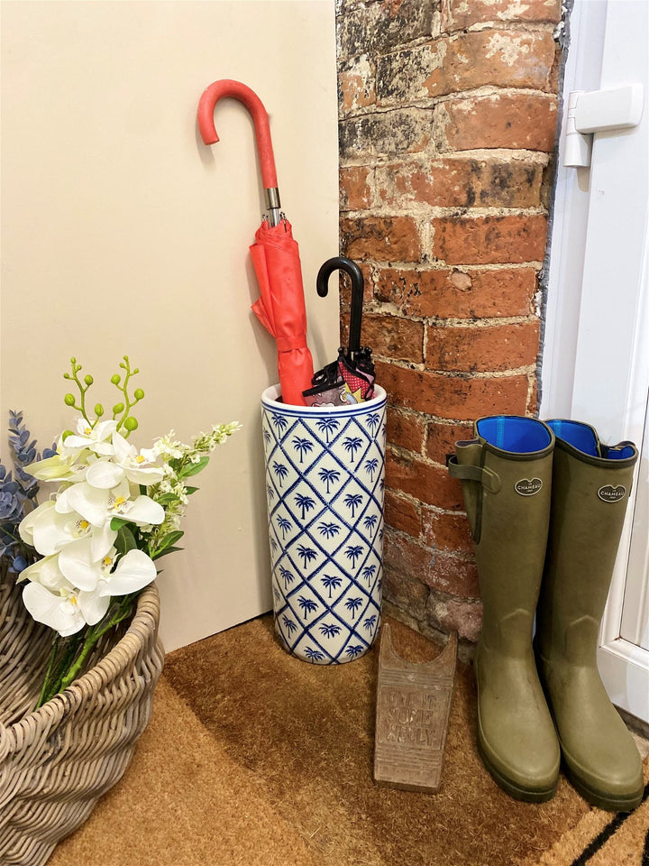 Blue Palm tree print ceramic umbrella stand, with a gloss finish. Perfect for keeping your hallway tidy. The internal diameter is 15cm and will hold several umbrellas. Measurements: D20 x H44 x W20cm