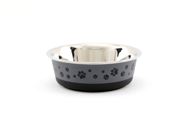 Stainless steel bowl with a rubber non slip bottom and black paw prints design. This bowl is perfect for a four legged friend's food or water as the non slip bottom means that it wont spill everywhere and the grey and black colours mean it'll fit in any home. Measurements: D14 x H5 x W14cm