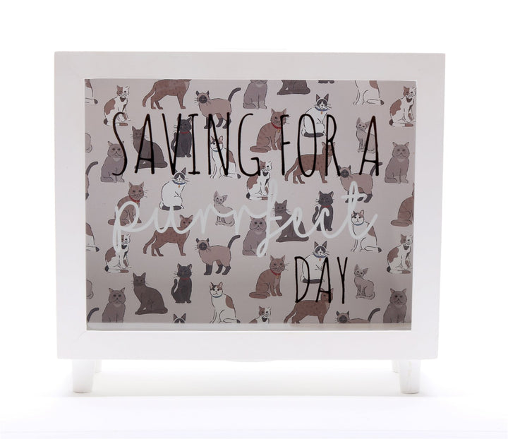 This money box with a glass front saying 'Saving for a purrfect day' and cat background is perfect for a cat lover to use to help save pocket change. The white colour means it would be great anywhere in the house. A money box on four legs that are 2cm high. It is white in colour with cat pictures on the back wall. The front window says 'Saving for a purrfect day'. At the top it has one central coin slot. Measurements: D7 x H18.5 x W20cm SKU: PG0062