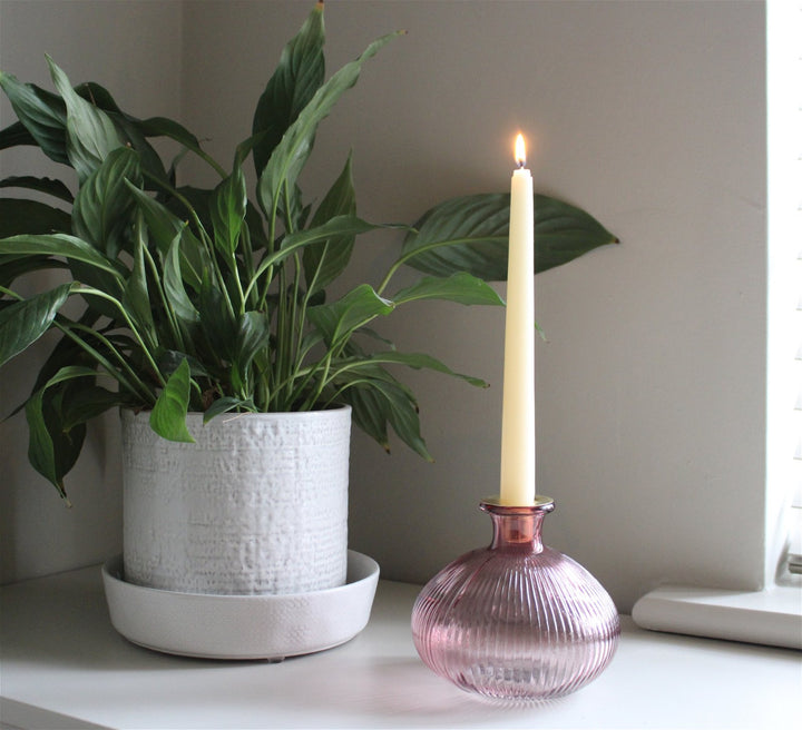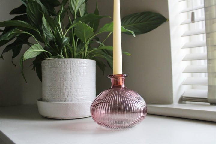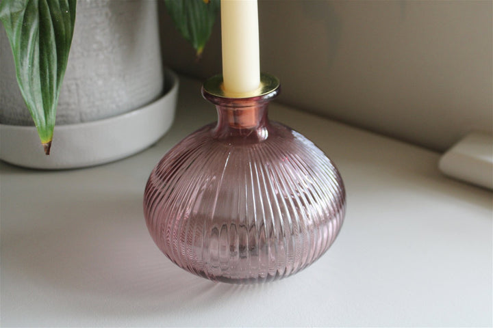 Pink ribbed glass candle holder with an antique gold rim detailing. Add some elegance to your table-scape with this onion shaped candlestick holder, perfect gift idea. Measurements: D14 x H12 x W14cm