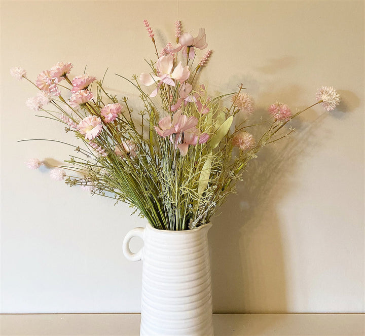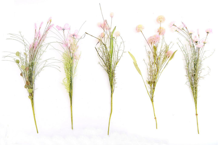 Bunch of five delicate pink faux wildflower stems. Perfect for everlasting arrangements. Can be arranged individually, or in a bunch. Each leaf, stem and flower has been designed to be as realistic as possible. Measurements: D10 x H51 x W10cm