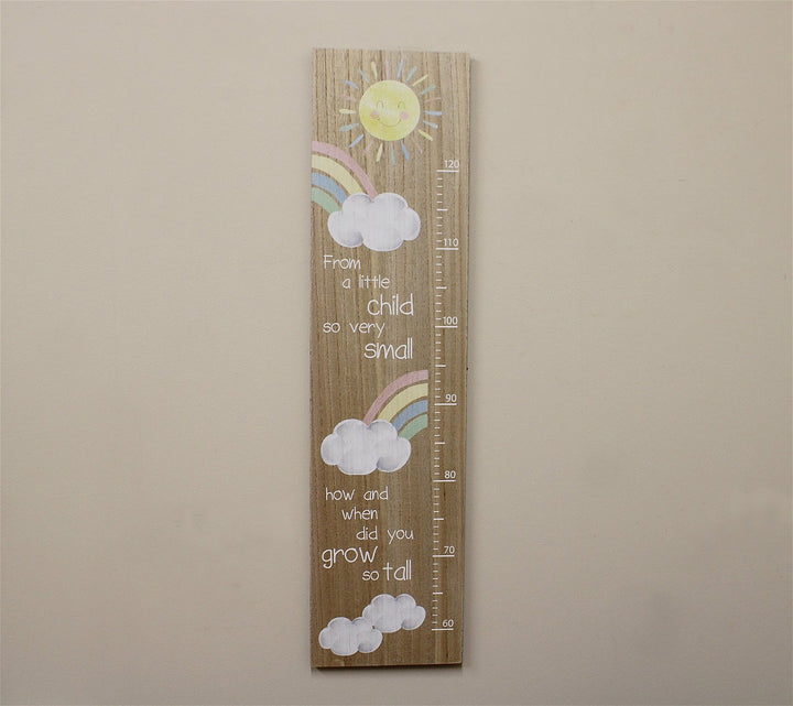A charming height chart in the style of a giant ruler. Decorated with a painted sunshine and rainbow design. With the words "From a little child so very small, how and when did you grow so tall?" This wall hanging height chart has two eyelet fittings on the reverse, 6.5 cm apart. To be hung 60cm above the floor. Measurements: D2 x H80.5 x W20cm