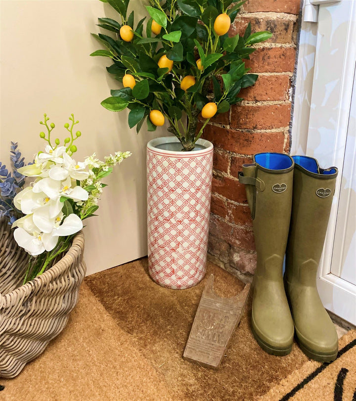 Red and White ceramic umbrella stand in a floral Daisy chain design, with a gloss finish. Perfect for keeping your hallway tidy. The internal diameter is 15cm and will hold several umbrellas. Measurements: D20 x H44 x W20cm