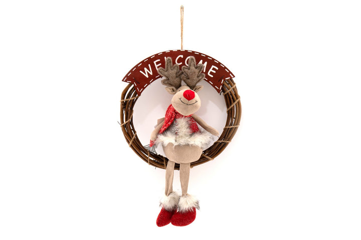 A wood and fabric hanging door decoration. Red 'Welcome' message wooden wreath with a fabric deer in beige and red nose, boots and scarf that sits within the wreath. The wreath measures 30cm in diameter and the deer measures 38x23cm. A fun festive addition to any home. Overall measurements: D15 x H46 x W31cm
