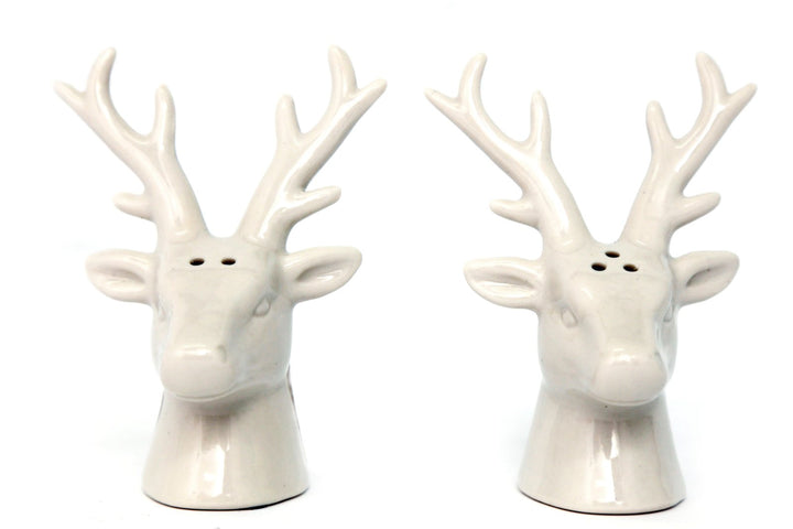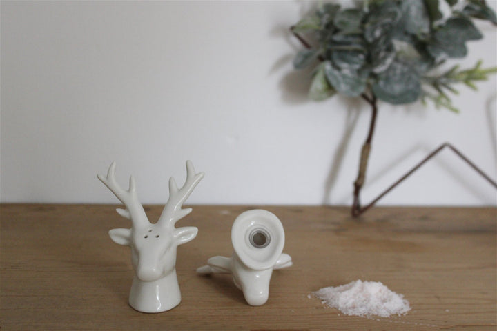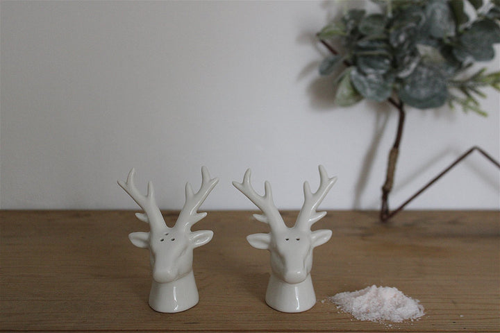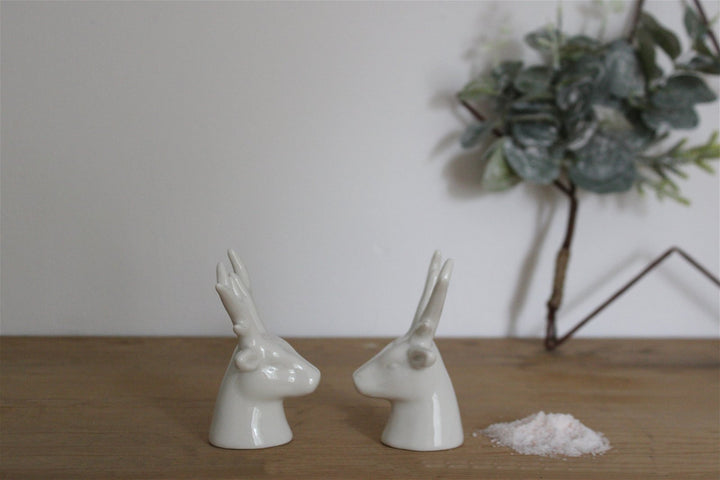 Transform your dining experience with this set of elegant Reindeer salt and pepper shakers. Made from high quality ceramic, finished in a white gloss. Includes two silicone stoppers, hand wash recommended. Perfect gift idea. Measurements: D5.8 x H9.8 x W7.5cm