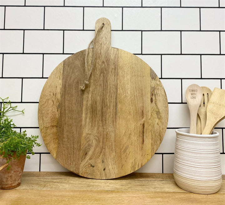 This large round wooden serving board is a beautiful and versatile piece that is perfect for entertaining guests or displaying food. Made of high-quality, durable wood, it is both functional and elegant, with a natural wood grain that adds warmth and charm to any setting. This simplistic but stunning board comes complete with small handle and jute string loop, perfect for storing. The underneath has four small felt anti slip pads. Measurements: D1.5 x H40.5 x W50cm