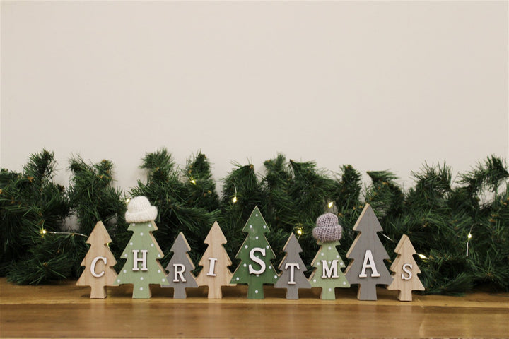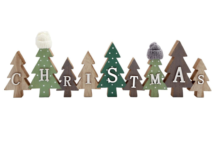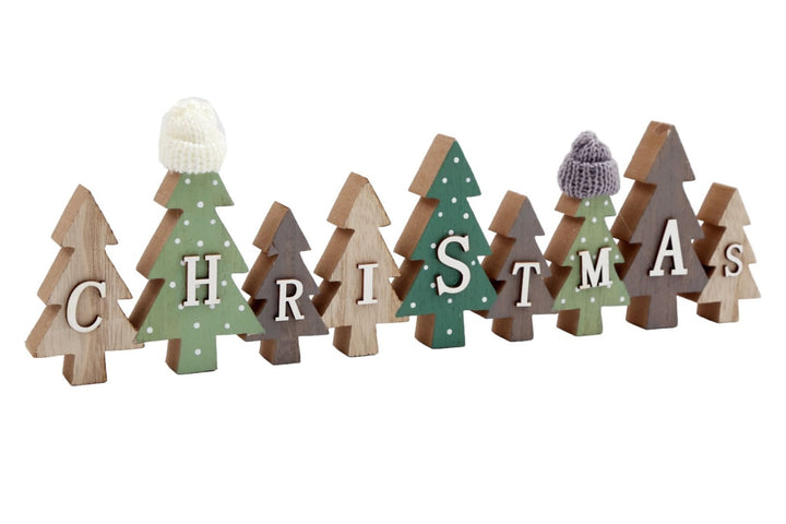 A wooden free-standing Christmas display sign with miniature knitted hats. The woodland effect sign is perfect to display in the home this festive season. Measurements: D1.5 x H11 x W40cm