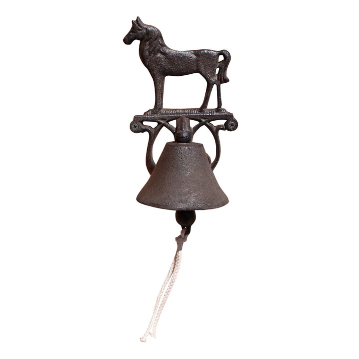 Rustic Cast Iron Bell with a horse design, perfect for horse lovers. This bell can easily be mounted onto a wall using the pre-drilled holes and can be used both internally and externally (fixings not included). Measurements: 15 x 25 x 15cm