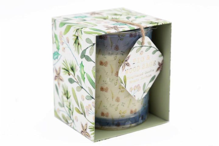 White Fig & Sage candle in a gift box. A festive white candle in a glass pot with Christmas foliage design. These are a lovely decoration for any room. This item comes gift boxed and would make a perfect gift. Overall boxed measurements: D8.5 x H10 x W8.5cm