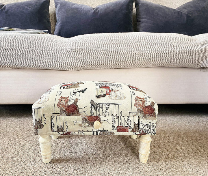 Scottie dog fabric footstool with a single drawer. A sturdy footstool covered in a Scottie dog print design. This footstool has a useful storage drawer with a wooden handle, it is both practical and stylish in all homes. Wooden legs are included inside the footstool, the legs screw into the base, no tools are required. Inside drawer measurements (W x D x H): 27cm x 22.5cm x 5cm. Legs are 11cm in length. Measurements: D26 x H28 x W41cm