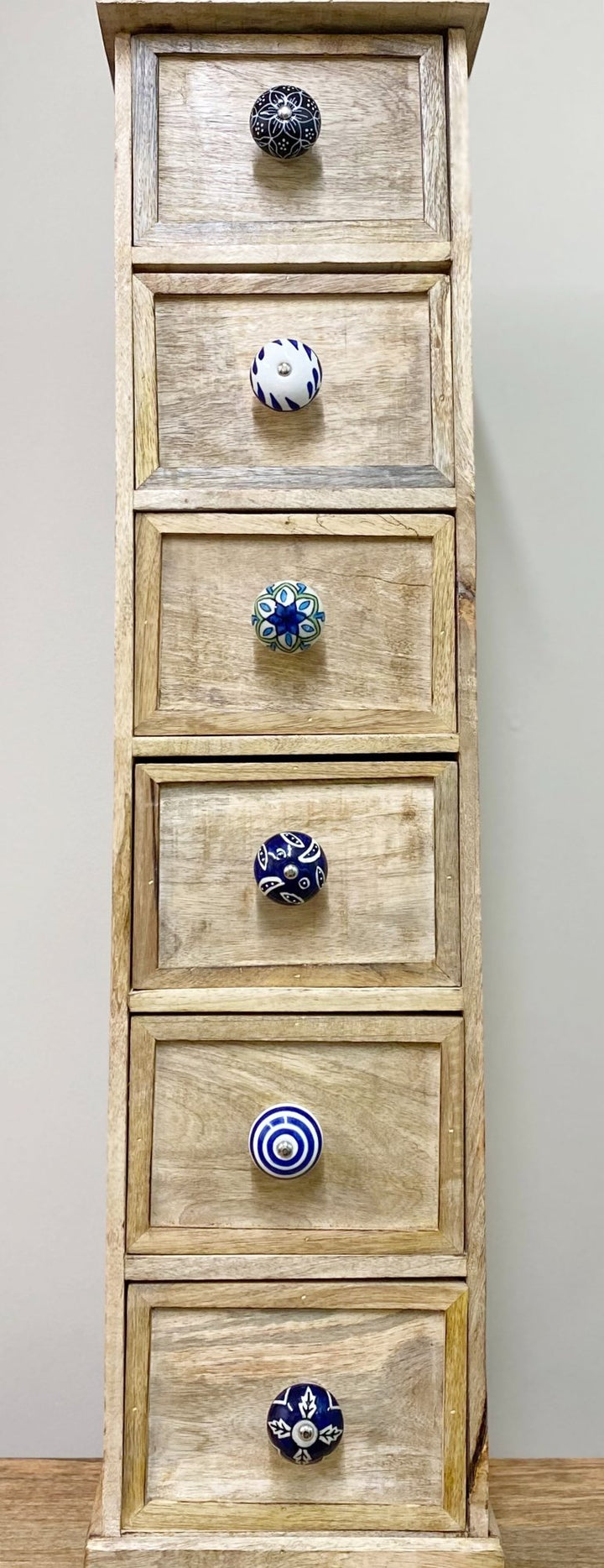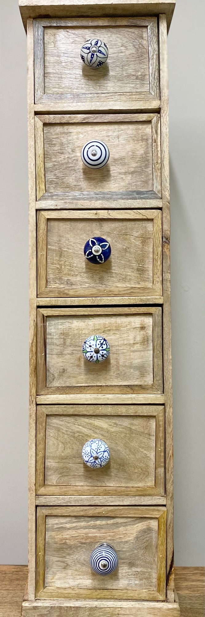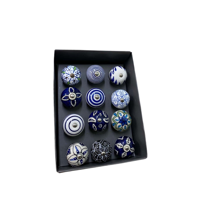 An attractive set of 12 ceramic knobs, all of different designs predominately blue. This eclectic set of knobs could brightened up any furniture types perfect for up-cycling. Each knob is 4cm diameter with a 3cm spindle. Overall measurements are: D16 x H7.5 x W21cm SKU: HH5580