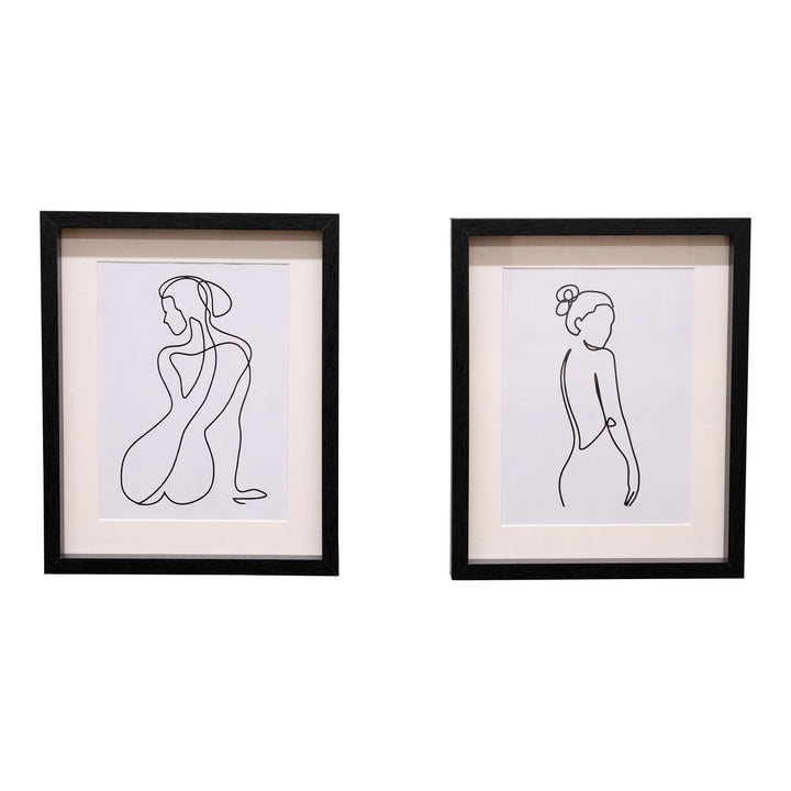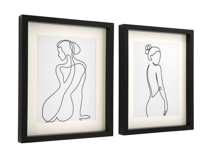 A set of two prints, mounted in black frames these female silhouette pictures along with simple colours would grace any living space. These black picture frames are 1.2 cm wide with a cream inner border 2.5cm wide containing line sketches of a female model in two poses. The measurements of each frame are: H25 x W20cm SKU: WO0005